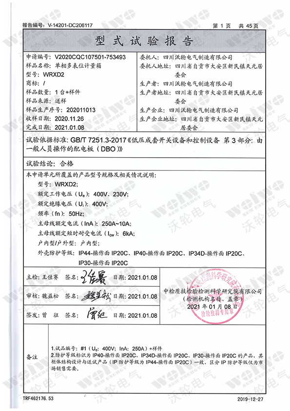 型式試驗(yàn)報(bào)告(單相多表位計(jì)量箱-WRXD2)-1
