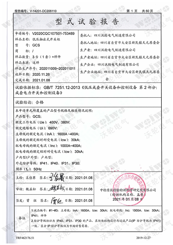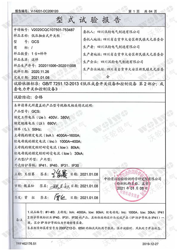 型式試驗(yàn)報(bào)告(低壓抽出式開關(guān)柜-GCS)-1